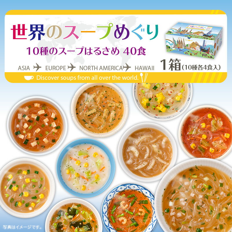 和洋中10種類40食がセットになった「世界のスープめぐり」はいかがでしょうか?みそ、チゲ、中華しょうゆなどアジア系6種とオニオンスープ、ミネストローネなどヨーロッパ・アメリカ系スープ4種の詰め合わせなので飽きずに召し上がれると思います。また、おしゃれなボックス入なので贈り物にピッタリだと思いますよ。