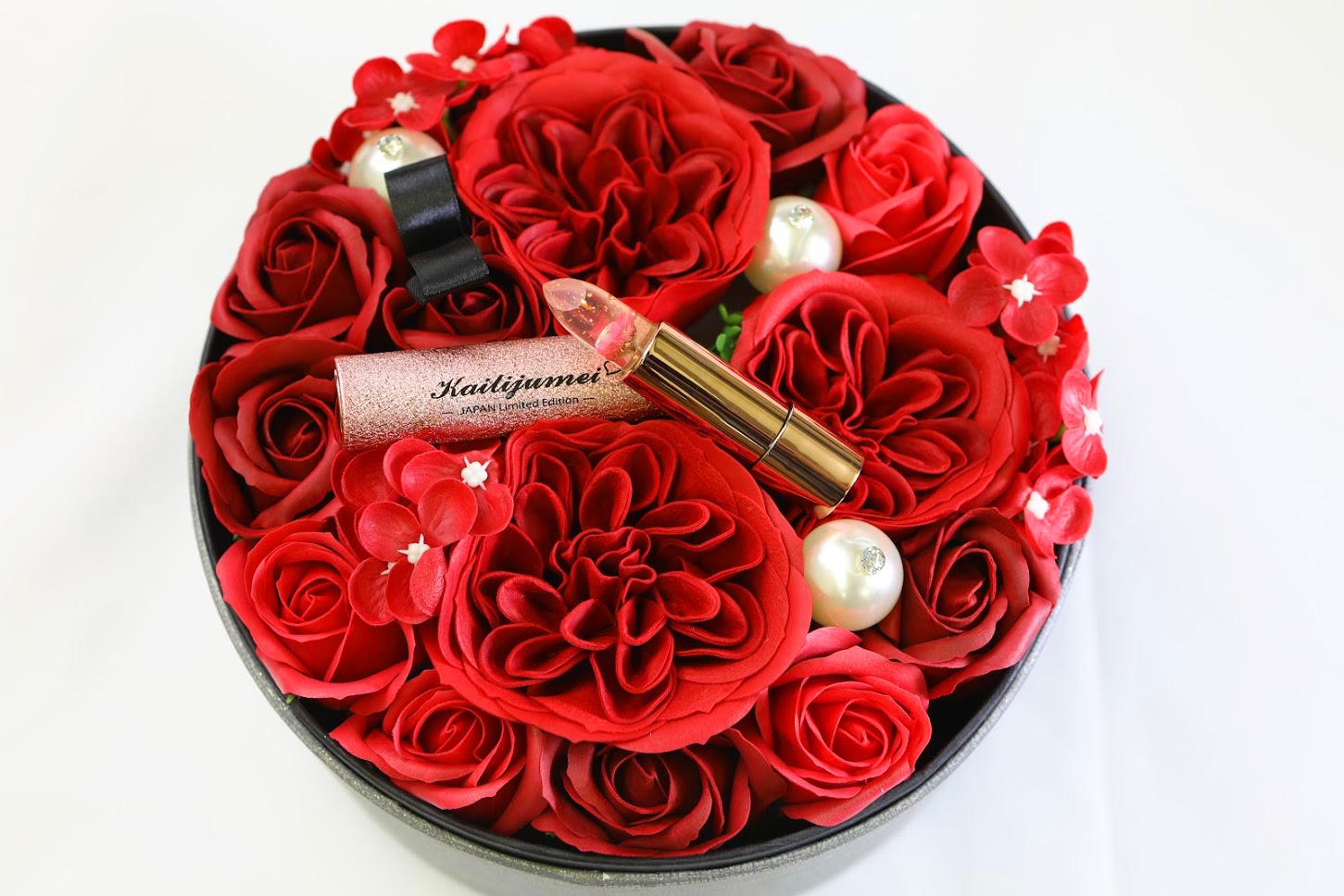 大人な女性のお祝いに、カイリジュメイのフラワーリップとソープフラワーのセットはどうでしょう?フラワーリップはお花が入っていてかわいいし、石鹸でできたお花もとても素敵で、箱を空けるとびっくりすると思います。そしてインスタ映えする!赤はちょっと派手すぎるならピンクと白のソープフラワーもありますよ。