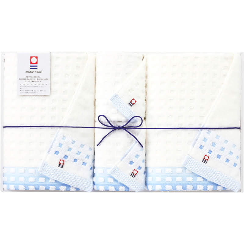 今治のタオル詰め合わせセットです(バスタオル✕2枚、ウォッシュタオル✕2枚)。白地にほんのり蒼色が入った色合いで、男女問わずご家族で使えるお品だと思います。