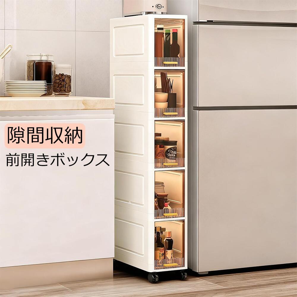 冷蔵庫横の微妙なスペースに収まりやすく対応できる超スリムタイプのストッカーがおすすめ。瓶詰めなどの食材ストックから調理アイテムまで、たっぷりと5段で対応できる使用感の良い商品です。キャスターを備えているので、お掃除の時など移動も簡単に行えますね。