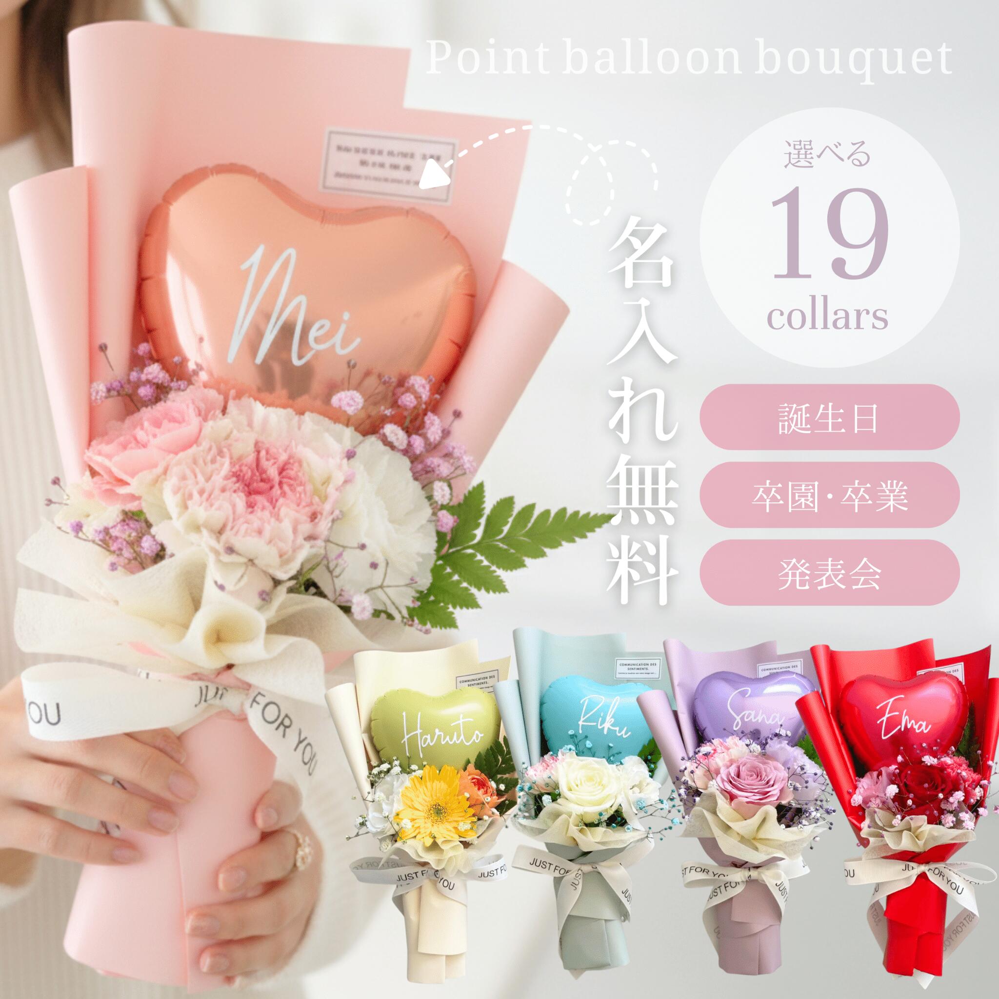 ガーベラやカーネーションなどの生花に大きなハート型のバルーンをあしらったこちらの花束バルーンはいかがでしょうか。バルーンには名入れも可能でプチプラながら見栄えのする花束です。