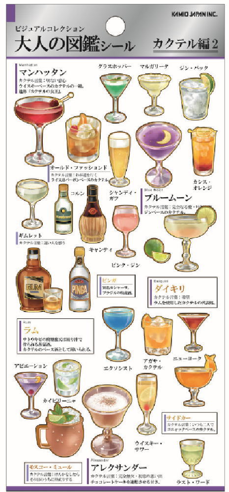 こちらの、大人の図鑑シールは色々なバージョンがありますよ。これは世界のカクテルの図鑑という珍しいもの。アニマルやお花などお好みを探してみてください。