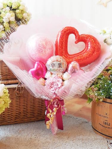 オープンハートのおしゃれなバルーンブーケです。華やかなデザインと色使い、かわいいイメージなので、卒業式のお祝い用にふさわしいと思います。