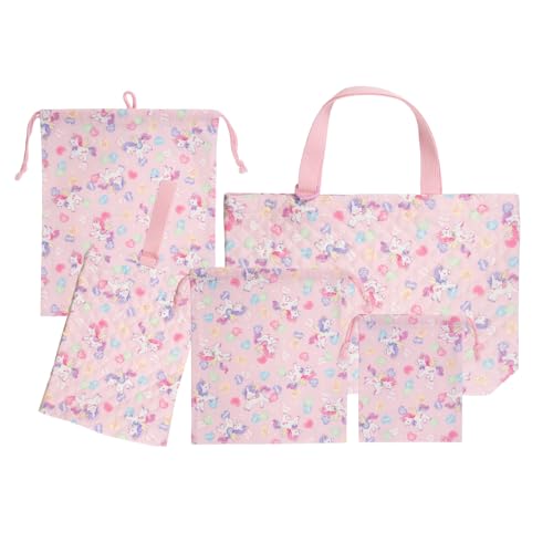 ユニコーンとハートのピンクのデザインで、おしゃれです キルティング生地で軽くて丈夫です レッスンバッグ、シューズバッグ、体操着袋などの5点セットで便利です