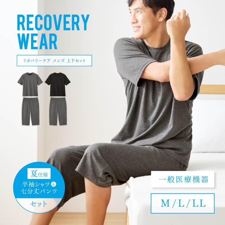 上下セットで着こなせるおしゃれなリカバリーウェア!このリカバリーウェアは、一般医療機器に分類される高品質なリカバリールームウェア♪半袖&7分丈のパンツもスタイリッシュで見栄えが良く、寝ている間に疲労回復を促してくれるおすすめの癒しアイテムです。