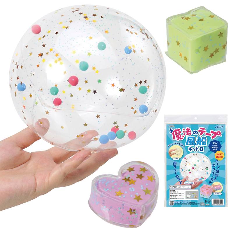 魔法のテープ風船のキットです。空気で膨らむテープで、SNSで今話題になっています。スクイーズも作れますよ。キラキラ素材でできており、とてもきれいで面白いです。子供にプレゼントすると大喜びします。