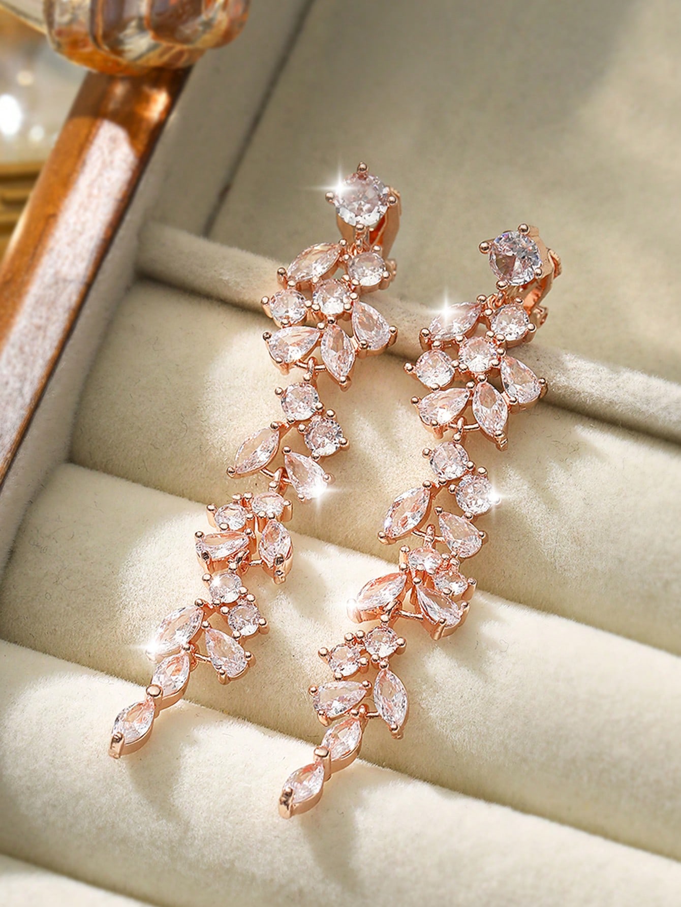 光沢のある葉の長いイヤークリップ はいかがでしょうか。美しいローズゴールドで存在感のある商品です。記念日のプレゼントにお勧めです。